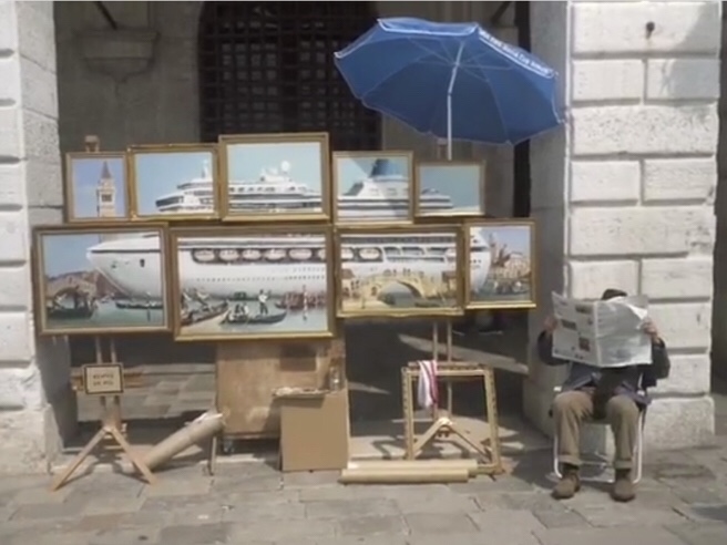 E qui scatta la duplice provocazione, contro la Biennale, colpevole di non averlo mai invitato – «Sistemando il mio cavalletto alla Biennale di Venezia – si legge sul social network – Nonostante sia l’evento artistico più prestigioso e importante del mondo non sono mai stato invitato» – e contro le grandi navi. Il collage di disegni firmati da Banksy va, infatti, a comporre una crociera che passa per il bacino di San Marco. Alla vista del video, gli ambientalisti veneziani sono andati in visibilio: «Grazie per il regalo», ha scritto il Comitato No Navi tra i quasi 6 mila commenti al post dell’artista.