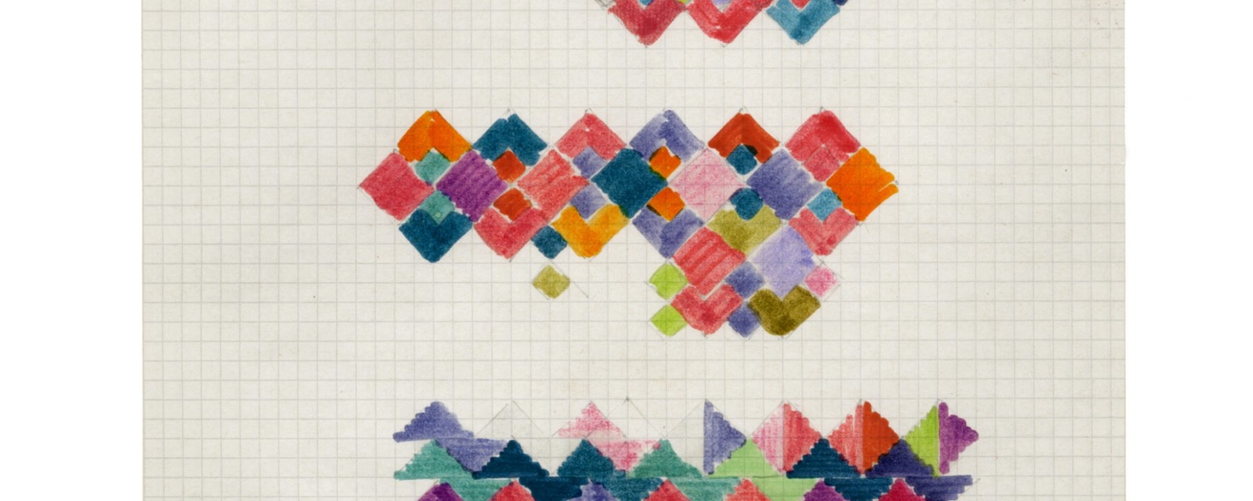 Oltre agli ampi arazzi, quindi, sarà possibile ammirare alcuni studi originali delle creazioni Missoni – tutti su carta a quadretti.Uno degli studi in mostra al Museo MA*GA. Ottavio Missoni era solito usare sempre pennarelli colorati su carta a quadretti. Courtesy Archivio Missoni.