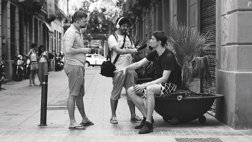 Prima di questa quarta fase al Centro Trevi, On Stage ha visto una prima tappa a Roma a giugno 2019: sono stati coinvolti esperti del settore, sociologi, scrittori e registi, che si sono confrontati lavorando sulla realizzazione di un testo -una drammaturgia- dove molto sottile era il confine tra realtà e finzione. L’audio di questi incontri sono stati trascritti e convertiti dall’artista in copione messo in scena, in un vero e proprio radiodramma, nella terza fase a Bolzano a luglio 2020. Nella seconda fase di Barcellona, a luglio 2019, l’artista ha lavorato in relazione allo spazio urbano, pubblico e privato, registrando suoni e dialoghi della quotidianità, creando, così, una mappatura sonora dei luoghi che, decontestualizzata attraverso un processo drammaturgico di editing del suono, è stata riproposta durante la presentazione al pubblico mediante diffusori audio posizionati sulle pareti della galleria. La presenza di un black box –costruito come una sala da regia radiofonica- offriva, inoltre, la possibilità di raccontare in tempo reale, al microfono, le immagini dai suoni ascoltati: attraverso cuffie wireless le narrazioni sovrapposte aumentavano il senso di straniamento. Infatti, in mancanza di un controllo effettivo della fonte, le interpretazioni narrative sono innumerevoli: l’impossibilità di verifica sul fatto accaduto permette di creare infinite drammaturgie.