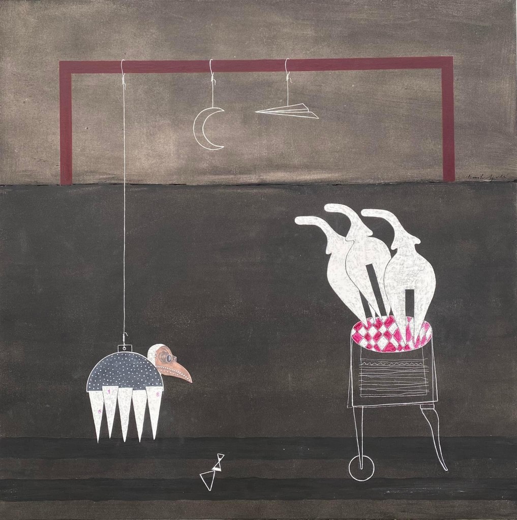 “ Abitare nei sogni “, il titolo racconta l’attenzione maniacale ad ogni dettaglio dell’artista che ci regala atmosfere indecifrabili e sognate, in cui ciascuno può leggere ciò che meglio crede. Perché in fondo è questo ciò che provano a fare tutti i Surrealisti: come degli alchimisti, lavorano i colori e le forme per suggerire immagini che recuperano da un inconscio comune. Stimolano i nostri sensi mostrandoci le loro paure, i loro desideri, i loro sogni più reconditi, gli incubi ricorrenti.