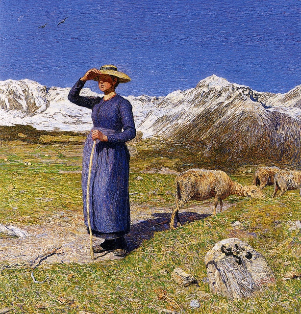 È il caso di Ave Maria a trasbordo e di A messa prima. Dipinta a Pusiano su suggerimento dell’amico pittore Emilio Longoni, Ave Maria a trasbordo sembra rappresentare la celebrazione di un rito universale che coinvolge uomini, animali e natura nella gestualità quasi pregante del contadino che voga e nella silenziosa devozione con cui la madre abbraccia il bimbo. Più di ogni altro quadro famoso di Segantini contiene elementi e immagini fortemente evocativi della religiosità dell’artista, sintesi della filosofia panteista con la tradizione cattolica, fede in un Dio che è nell’intimo di ciascun uomo come in tutte le manifestazioni della natura e del cosmo. Il nonno era profondamente religioso, anche se visse il suo rapporto con Dio in maniera molto personale. Con la mamma aveva frequentato la chiesa, perché quando si è poveri, malati e sofferenti si va spesso in chiesa a pregare. E l’atmosfera delle chiese, calda e misteriosa, suscitò nel bambino un’impressione intensa e durevole. In un angolo della casa si era costruito un altarino con le immaginette dei santi. Un giorno il parroco del paese fece visita alla famiglia e regalò al piccolo un quadro del matrimonio di Maria, dove le figure dei sacerdoti erano rappresentate con gli abiti e i paramenti tipici della tradizione ebraica. Il nonno rimase così deluso e confuso nel vedere i preti in una foggia diversa da quella a cui era abituato e in cui credeva che subito distrusse l’altare e da allora guardò sempre con diffidenza e scetticismo alle istituzioni religiose. Penso che Giovanni Segantini sia stato un precursore dell’arte contemporanea tant’è vero che sul finire del XIX secolo, con il colossale trittico dal titolo La vita, La natura e La morte, Giovanni Segantini realizzò una delle ultime e più significative opere programmatiche della propria epoca. Ideato come ciclo monumentale da esporre all’Esposizione Internazionale di Parigi del 1900, il maestro lo aveva inteso come rappresentazione dell’esistenza umana in perfetta armonia con la natura. Le semplici figure agresti e gli animali in esso raffigurati, infatti, si muovono entro il perenne ciclo delle stagioni. Inoltre, con l’imponente panorama del paesaggio alpino dell’Engadina, l’artista creò una visione panteistica di straordinario impatto figurativo, una vincente controproposta pittorica alla dura e opprimente realtà dell’industrializzazione metropolitana. La fama internazionale di Segantini, così come la sua valenza nella storia dell’arte, sono legate all’originale convivenza, nelle sue opere, di una natura osservata in modo acritico e un intrinseco valore profondamente simbolico. L’artista riuscì a far confluire il paesaggio alpino, colto in tutte le sue sfumature e senza eccessivo illusionismo, in immagini allegoriche di straordinaria luminosità. Se da un lato Segantini, con le sue immagini delle Alpi, può essere inteso come uno dei principali esponenti del simbolismo europeo, dall’altro il divisionismo italiano, che da lui fu notevolmente influenzato, può considerarlo un innovatore dell’arte pittorica. È proprio nella pittura dei divisionisti che possiamo riscontrare il segreto della luminosità dei dipinti di Segantini. La tecnica divisionista caratterizzata da fini pennellate, ravvicinate tra di loro, di puro colore rappresenta il suo determinante contributo alle correnti avanguardiste poco prima dell’avvento del nuovo secolo. Innovativa e rivoluzionaria, influenzò enormemente le successive generazioni di artisti, tant’è che gli stessi futuristi italiani, gli iconoclasti contemporanei, fecero di Segantini il loro modello ispiratore.