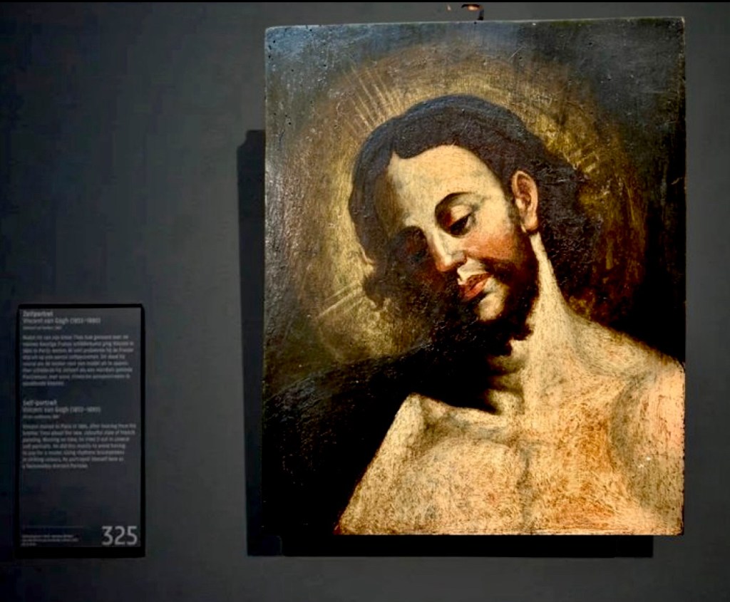 L’opera raffigura un busto maschile sacro, con lo sguardo lievemente inclinato verso il basso, avvolto da un’aureola dorata appena accennata e un fondo scurissimo, privo di decorazioni: un impianto che conferma la probabile destinazione originaria alla devozione privata, più che a una pala d’altare pubblica.